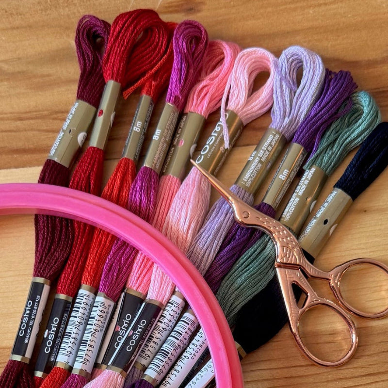 Add Embroidery Floss, Scissors, Hoops, and Needles; we even carry a variety of colorful Tea Towels to get you started!